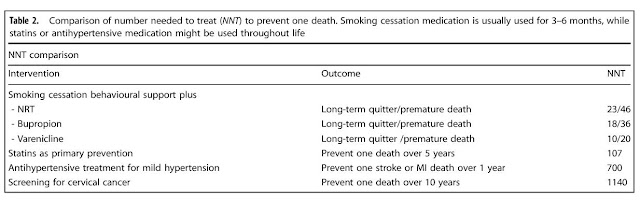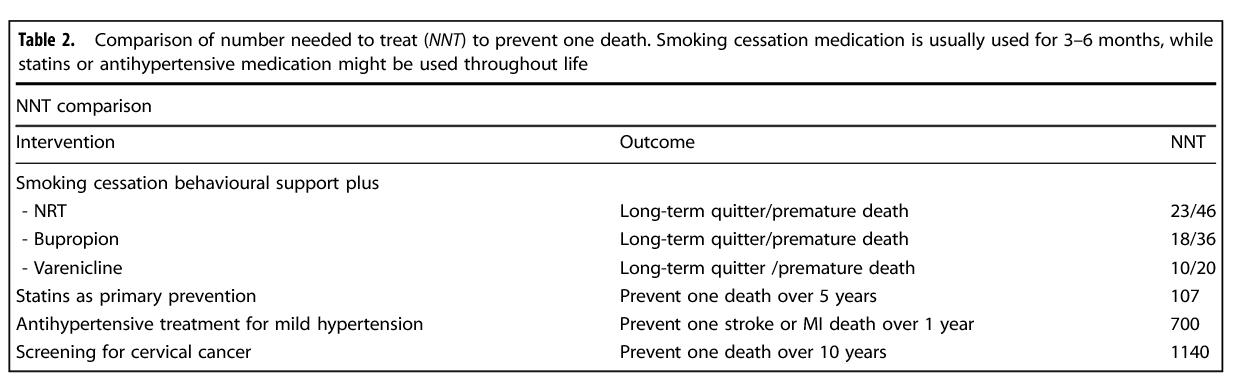 Me ha llamado la atención en el artículo el uso que hacen de los NNT (Número Necesario para Tratar) en relación con la ayuda para dejar de fumar. Para las terapias farmacológicas, se ha estimado que una persona logrará la abstinencia de 6 meses por cada 6-23 personas tratadas. Dado que aproximadamente la mitad de los fumadores morirán a largo plazo de una enfermedad relacionada con el tabaquismo, el abandono del consumo de tabaco es una estrategia preventiva muy eficaz. En comparación con otras intervenciones de prevención primaria ampliamente utilizadas, como el uso de estatinas, ayudar a dejar de fumar merece ser priorizada por los clínicos y los responsables políticos. Esta comparación puede demostrarse por el número necesario para tratar (NNT) para prevenir una muerte (ver tabla adjunta). Con el uso de vareniclina necesitamos tratar a 10 fumadores para lograr una abstinencia a largo plazo, y tratar a 20 para prevenir una muerte. Con estatinas para la prevención primaria debemos tratar a 107 durante 5 años para prevenir una muerte, o a 700 con antihipertensivo en hipertensión moderada durante un año para prevenir una muerte por ictus o infarto de miocardio. Hay que tener en cuenta que la medicación para ayudar a dejar de fumar se usa solo durante 3-6 meses mientras que las estatinas o los antihipertensivos se usan potencialmente durante toda la vida.